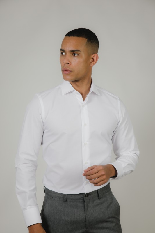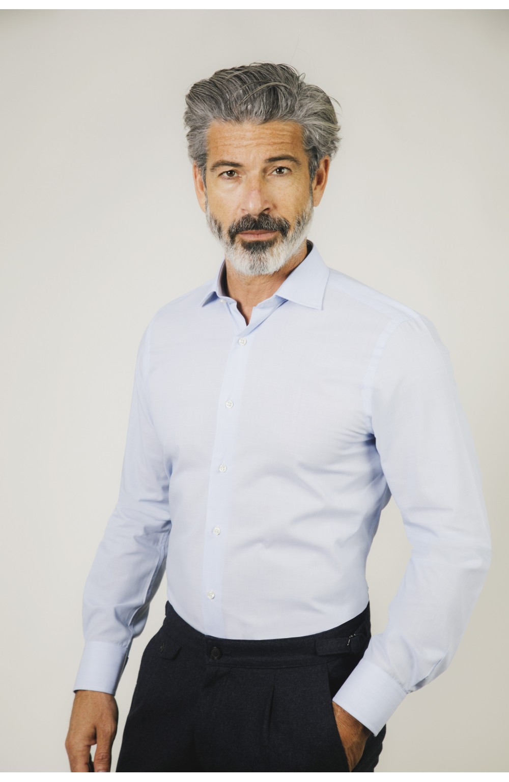 Camisa fil a fil semi entallada. Cuello de vestir y puños con doble ojal para poder utilizarla también con gemelos.