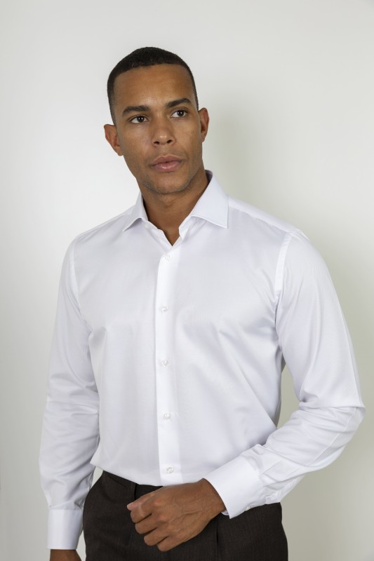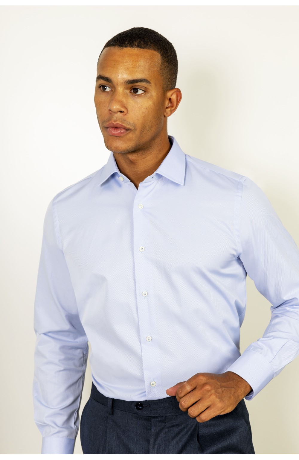Camisa de tejido diagonal semi entallada, cuello de vestir y puño con doble ojal para utilizarla también con gemelos.