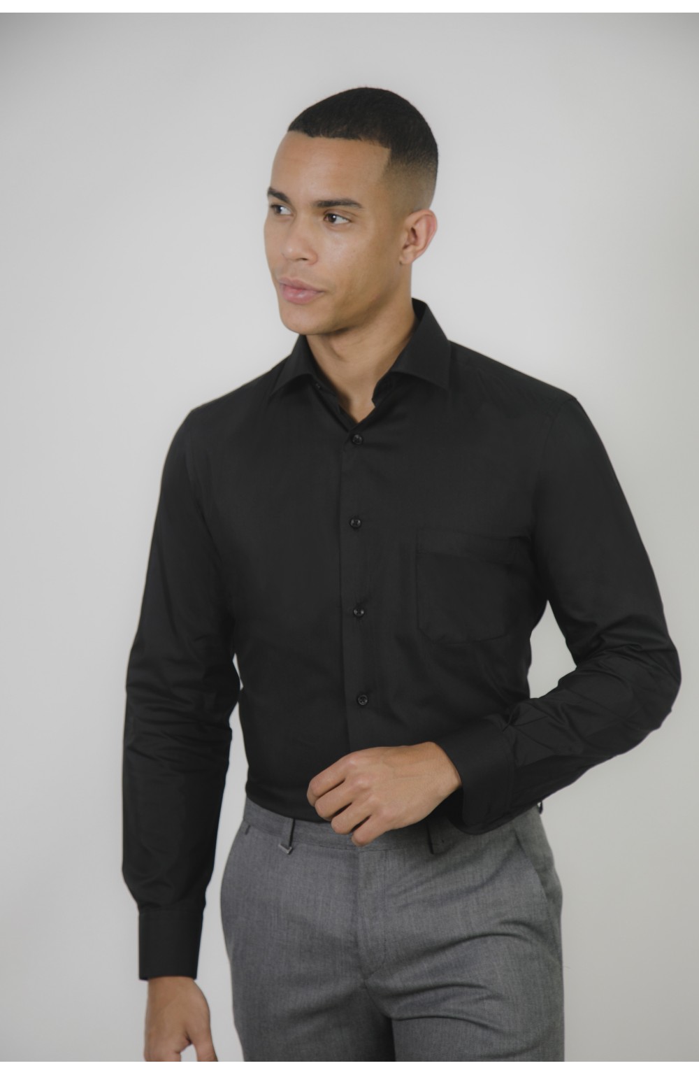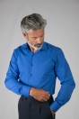 Camisa popelín "fácil plancha" lisa, con bolsillo, espalda con pliegues, cuello de vestir y puños con doble ojal para utilizarla también con gemelos.